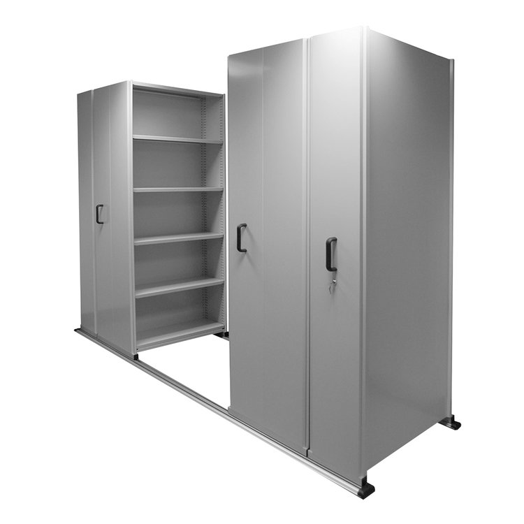 APC’s Compactus styled mobile shelving system represents the ultimate high density mobile storage unit. The Aislesaver shelving system can be easily relocated to suit changing office layouts, shelves are easy to adjust and bays are available in a variety of heights and widths. This system is ideal for storing heavy loads that need to be accessed often and easily. The system is designed to sit on top of a level carpet or flooring.