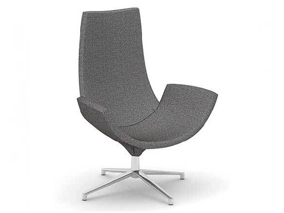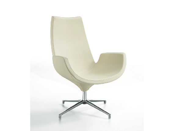 Armchair with high and low backrest and matching pouf. Cold-foamed polyurethane shell, upholstered in leather, eco leather or fabric on a steel insert, polished or painted aluminium 4-star swivel base.