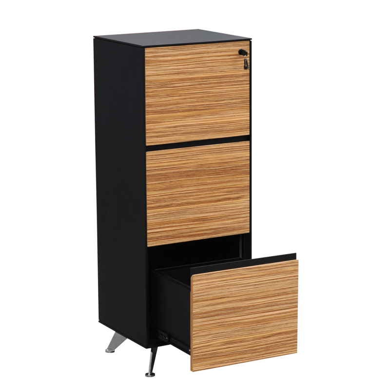 Cabinet with three Timber Veneer filing drawers, matt black 2 pack paint frame, and aluminium feet.